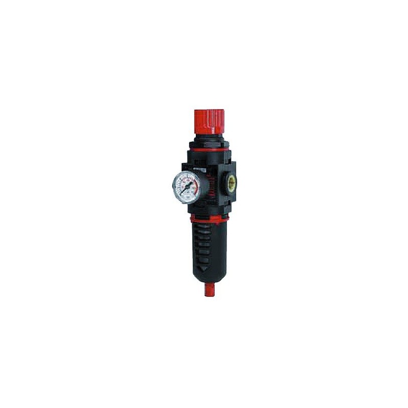 Regulator with gauge, filter and integrated drainage, designed to control and clean the compressed air, guaranteeing a stable flow and free of impurities in pneumatic systems.