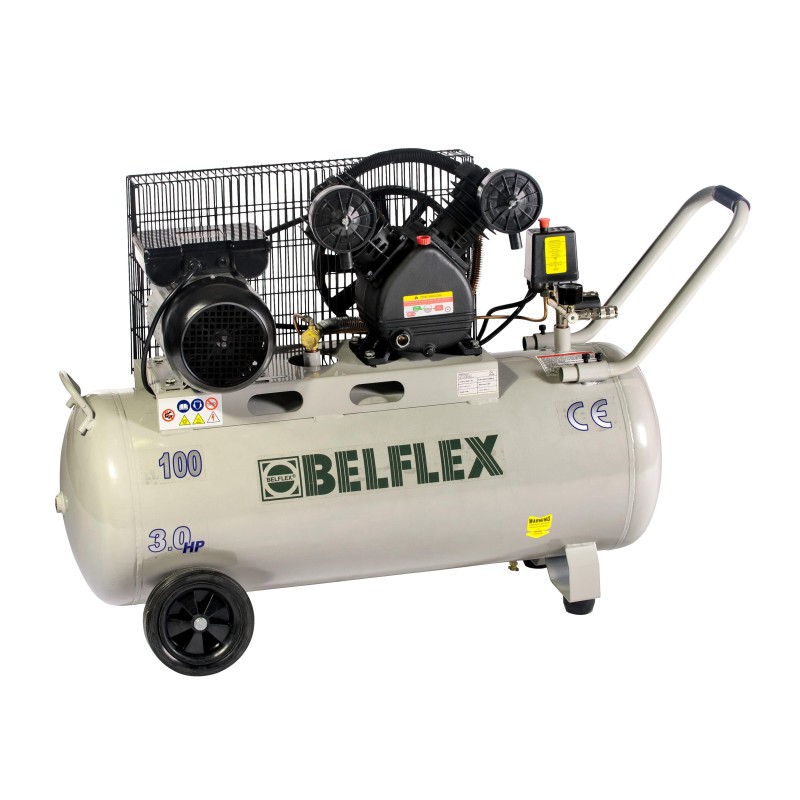 Belt transmission compressors. Optimum heat dispersion. High performance suction filter. Integrated belt guard. With wheels.