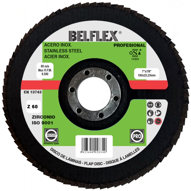 Professional line- Indicated for light grinding of outdoor surfaces, steels, welding, alloying materials, stainless steels and high alloy, casting, varnish, paint, plastic (zirconium). Discs with fiberglass support and zirconium abrasive fabric sheets inserted in radial enthusions. Manufactured under normative in 13743.