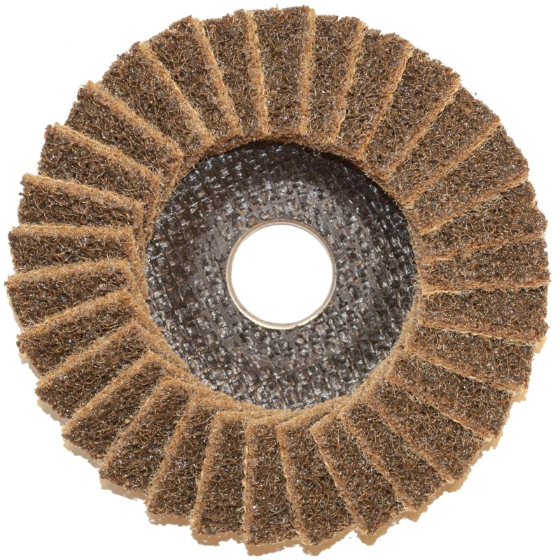 Discs with fiberglass base and non-woven fabric sheets (Scotch type) inserted in radial enthusions. Discs for surface conditioning, indicated for polishing and stainless steel nuanced, non-ferrous metals, glass, plastic and gum. Discs with Fiber Glass Support and Non-Wowen Cloth Flaps (Scotch Type). Sur Sur Fiber de Vere et à Lamelles de Tissu Abrasif (TIP SCOTCH).