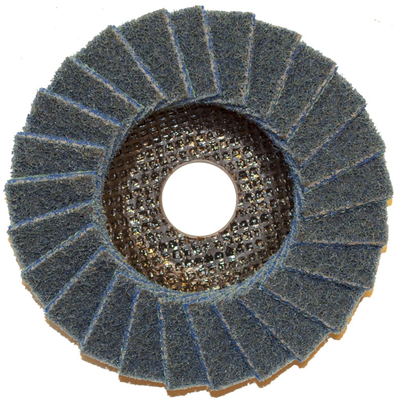 Discs with fiberglass base and non-woven fabric sheets (Scotch type) inserted in radial enthusions. Discs for surface conditioning, indicated for polishing and stainless steel nuanced, non-ferrous metals, glass, plastic and gum. Discs with Fiber Glass Support and Non-Wowen Cloth Flaps (Scotch Type). Sur Sur Fiber de Vere et à Lamelles de Tissu Abrasif (TIP SCOTCH).