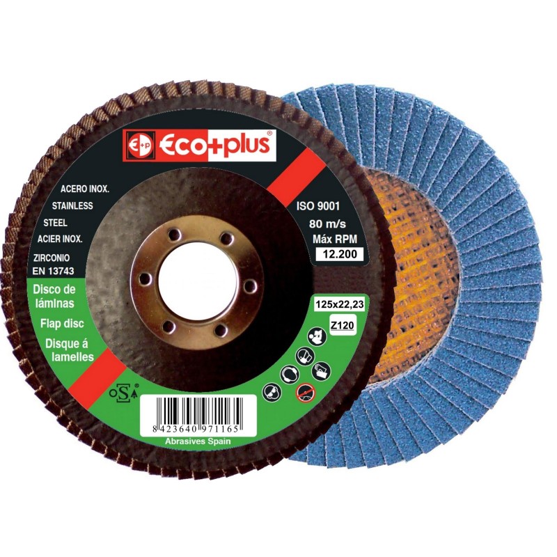 Standard line E + P - indicated for light grinding of outer surfaces, steels, welding, alloying materials, stainless steels and high alloy, casting, varnish, paint, plastic (zirconium). Discs with fiber support and abrasive fabric sheets in Zirconium, inserted in radial enthusions. Manufactured under normative in 13743.