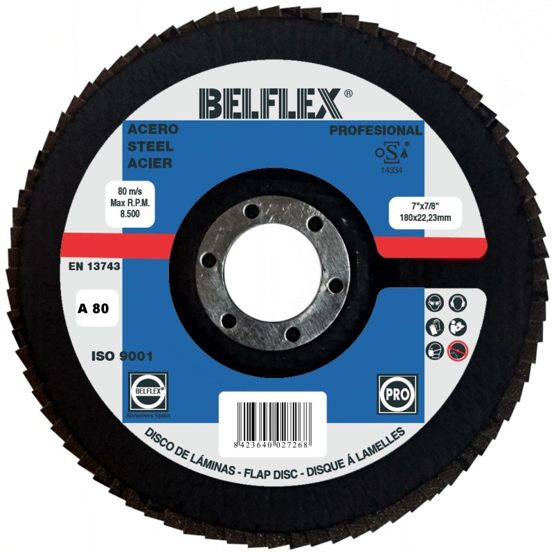 PROFESSIONAL - Indicated for the light grinding of outer surfaces, in steel, welding, alloyed materials, aluminum and wood (Corundum). Discs with fiberglass support and abrasive fabric sheets in Corundum, inserted in radial frames. Manufactured under regulations EN 13743.