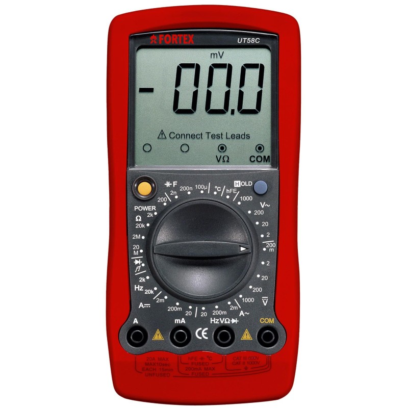 Multímetro digital con gran pantalla de visualización. Para medir corriente y voltaje AC/DC, resistencia, capacitancia, temperatura y frecuencia. Dispone de las siguientes funciones de test: diodos, continuidad con buzzer, transistor, memoria de datos, modo en espera y aviso de batería baja. Max.display 1999. Se suministra con funda, puntas de test y punta de contacto de temperatura. Doble aislamiento de seguridad CAT.II 1000V, CAT.III 600V, EN 61010-1 / EN 61326-1. UT58E: Multímetro digital con gran pantalla de visualización. Para medir corriente y voltaje AC/DC, resistencia, capacitancia, temperatura y frecuencia. Dispone de las siguientes funciones de test: diodos, continuidad con buzzer, transistor, memoria de datos, impedancia de entrada para la medición de voltaje DC (alrededor de 10M?), modo en espera y aviso de batería baja. Max.display 19999. Se suministra con funda, puntas de test y punta de contacto de temperatura. Doble aislamiento de seguridad CAT.II 1000V, CAT.III 600V, EN 61010-1, EN 61326-1.