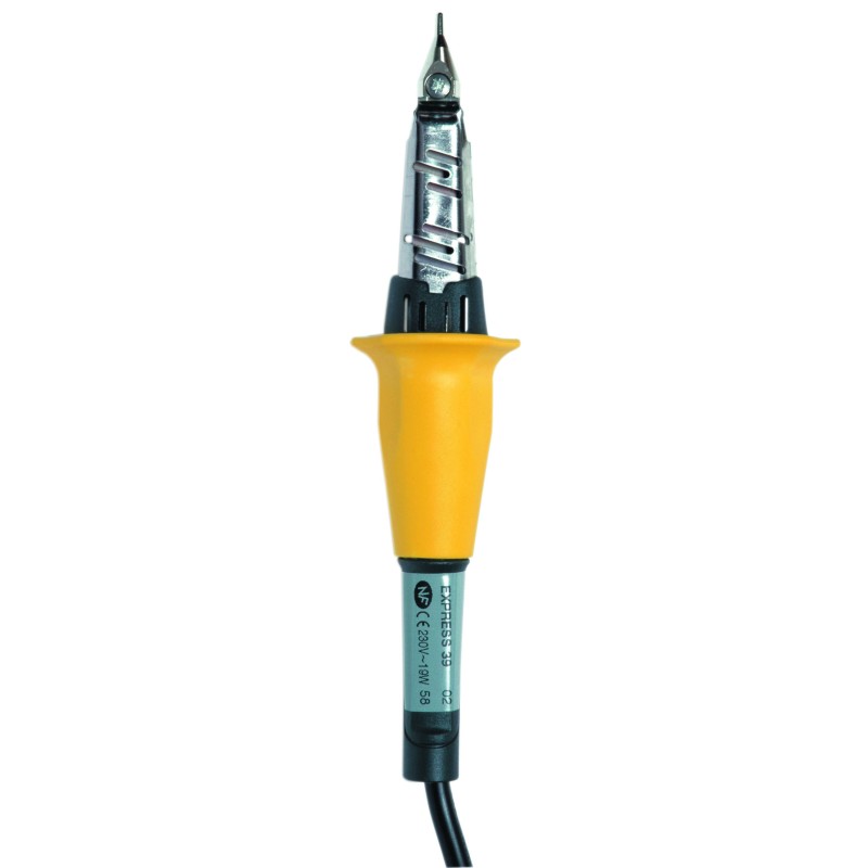 Heating time 1 minute. Detachable nickel-plated brass tip. High thermal performance. Stabilized heating temperature. Very manageable with flexible and ergonomic handle. Integrated support collar. Electronics / Electricity / Electronics / Electricity / Electronique / Electricité