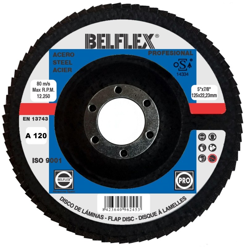 PROFESSIONAL - Indicated for the light grinding of outer surfaces, in steel, welding, alloyed materials, aluminum and wood (Corindon). Discs with fiberglass support and abrasive fabric sheets in Corindon, inserted in radial frames. Manufactured under regulations EN 13743.