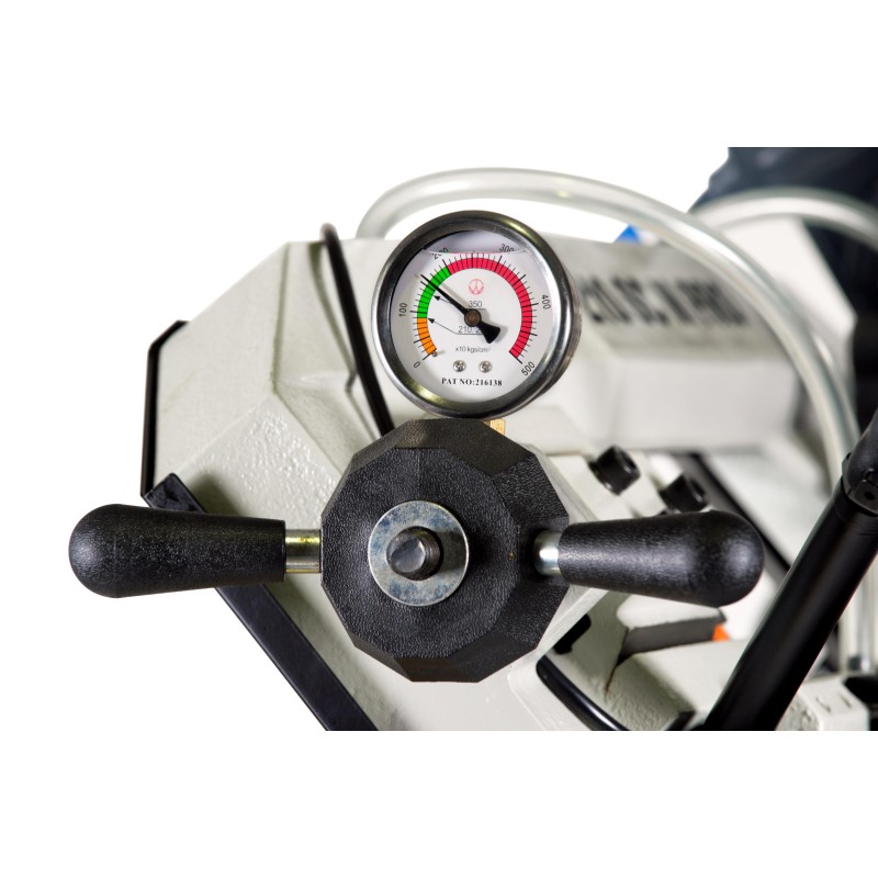 Jaw. Rotating head of 0 to 60º. Refrigeration pump with double circuit. Drop of the head with manual or hydraulic descent selector. Ease of adjusting the cut angle. Large base for good stability. Automatic stop at the end of the cut. Leaf guide supported on ball bearings. Emergency switch and cover opening safety. Leaf tension manometer. Machines manufactured according to EC standards.