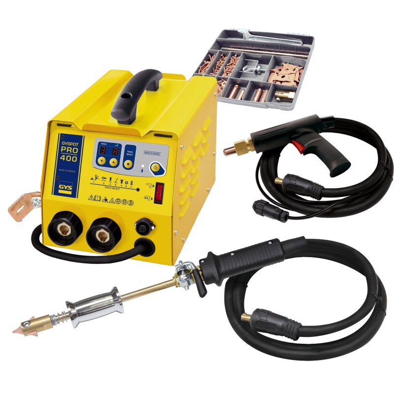 Desabollador de acero 400V con potencia de 3800A Ideal para todo tipo de obras de alineación y desabollo de acero. Productivo gracias a sus dos pistolas con sistema de cebadora automático o manual y su panel de control intuitivo.