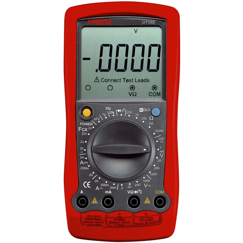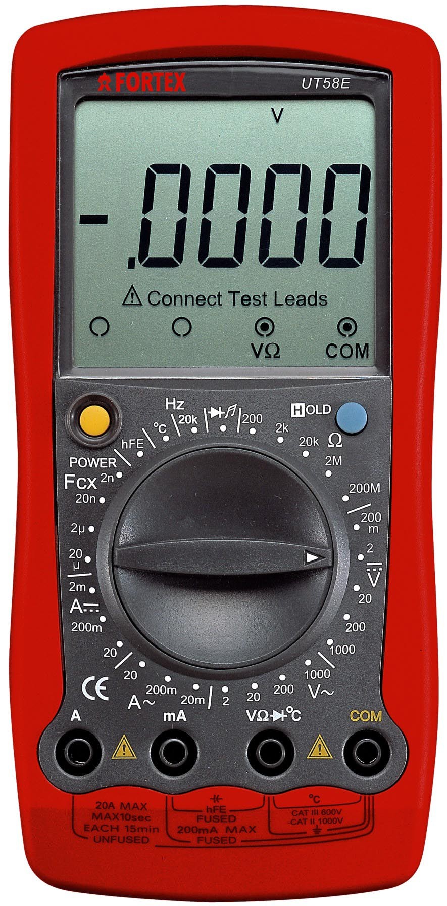 Multímetro digital con gran pantalla de visualización. Para medir corriente y voltaje AC/DC, resistencia, capacitancia, temperatura y frecuencia. Dispone de las siguientes funciones de test: diodos, continuidad con buzzer, transistor, memoria de datos, modo en espera y aviso de batería baja. Max.display 1999. Se suministra con funda, puntas de test y punta de contacto de temperatura. Doble aislamiento de seguridad CAT.II 1000V, CAT.III 600V, EN 61010-1 / EN 61326-1.