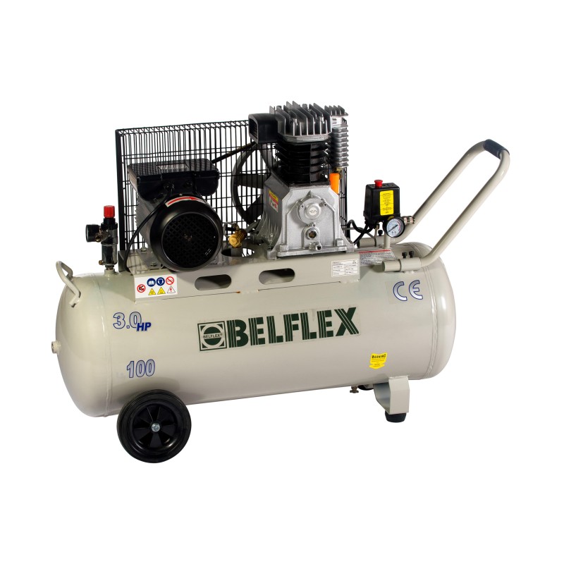Compresseurs de transmission de courroie. Dispersion de chaleur optimale. Filtre d'aspiration haute performance. Garde de ceinture intégrée. Avec des roues.