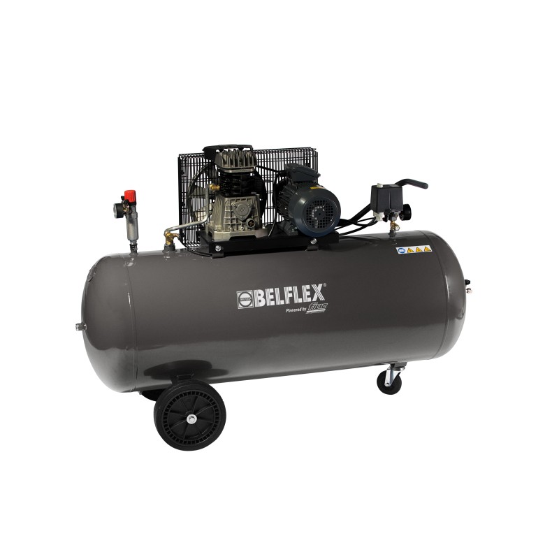 Compresseurs de transmission de courroie. Vannes en acier inoxydable. Aigres de tête spacieuses. Dispersion de chaleur optimale. Refroidissement optimal de l'air. Garde de ceinture intégrée. Avec des roues.
