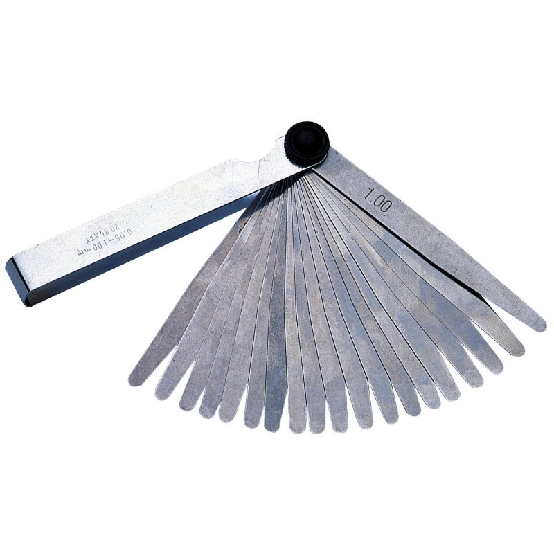Jauges d'épaisseur avec 20 lattes de 0,05 à 1 mm, idéales pour des mesures de séparation et de réglage précises. Fabriqué en acier tempéré, durable et facile à utiliser.