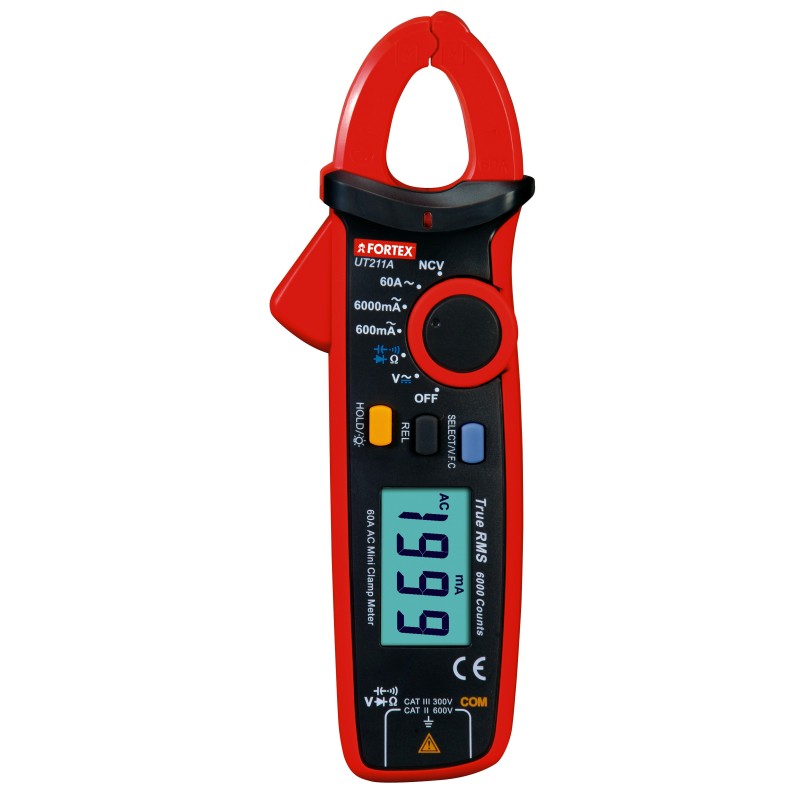 Multimètre numérique avec mini pince et écran rétro-éclairé. Pour mesurer la tension de courant alternatif et ac / dc, résistance, température et fréquence. Il présente les fonctions de test suivantes: diodes, continuité avec sonnerie, RMS, surtension AC / DC, mode de pic de tension, mode maximum, mémora de données, mode relatif, impédance d'entrée pour la mesure de la tension alternative (environ 10 m?), Le mode d'attente et l'avertissement de la batterie faible. MODE AUTOMATIQUE (ALRÉ DE 15min) max. Affichage 6000. Il est fourni avec des conseils de test et un sac de transport. CAT II.600V, CAT III.300V, UL61010-1, EN61010-1, EN61010-2-032, EN61010-2-033, EN61326-1.